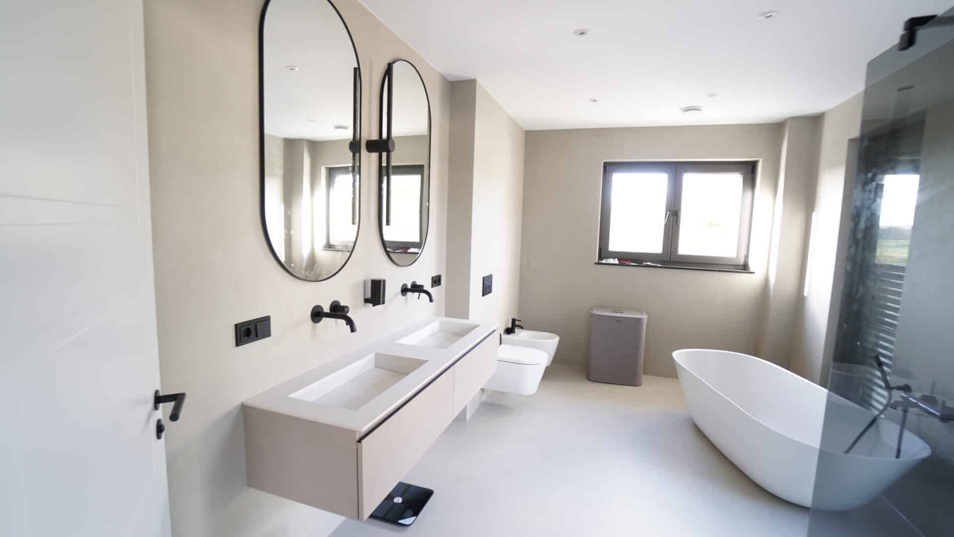 Wir unterscheiden hierbei zwischen funktionalen Flächen und Bereichen, die nicht direkt mit Wasser in Berührung kommen. In Zonen ohne Wasserspritzer setzen wir bewusst auf atmungsaktive und natürliche Materialien wie Lehm oder Kalk. Diese Materialien schaffen nicht nur eine gesunde Raumluft, sondern verstärken die ästhetische Wirkung des Raumes. So entsteht ein harmonisches Zusammenspiel aus Funktionalität und natürlichem Design, das dein Badezimmer zu einem echten Wohlfühlort macht.